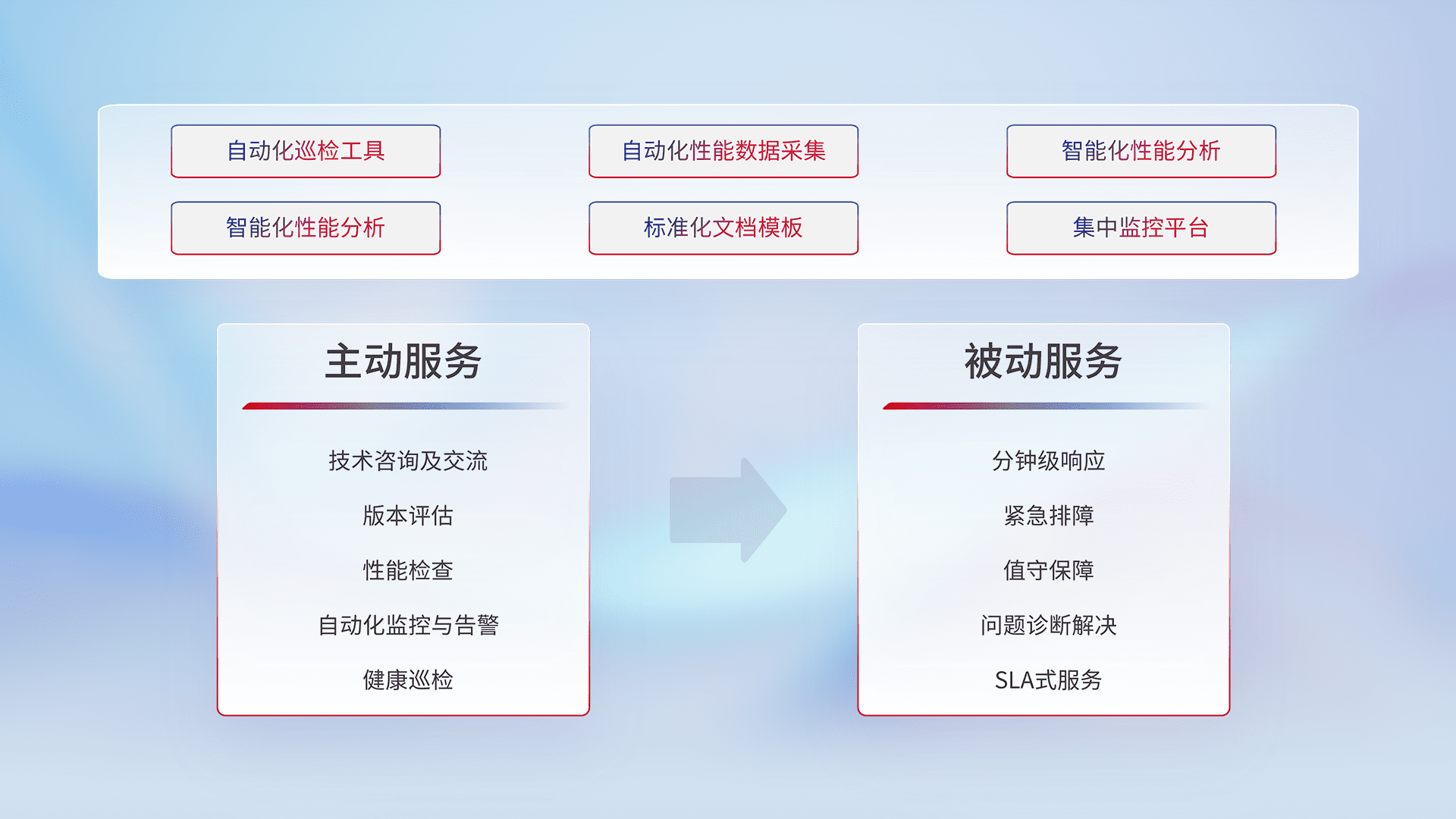 智能化工具和标准化文档,,,保障服务质量,,,提供主动服务(包含技术咨询、、、、版本评估、、性能检查、、、自动化监控与告警、、、、健康巡检)和被动服务包含(分钟级响应、、、、紧急排障、、、、值守保障、、、问题诊断解决、、SLA服务)。。